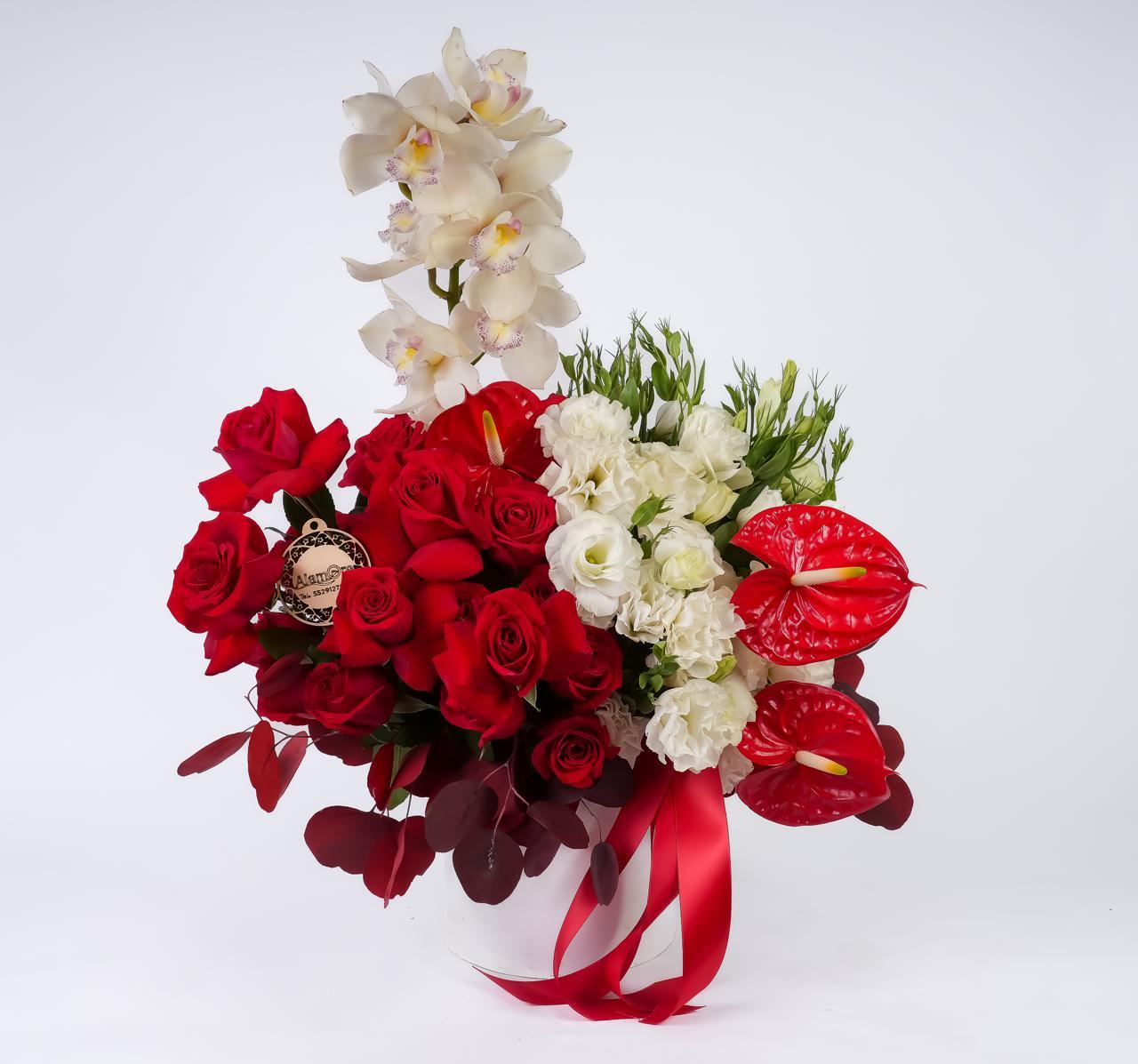 Composición de rosas rojas, lisiantus blanco, anturios rojos y orquídeas