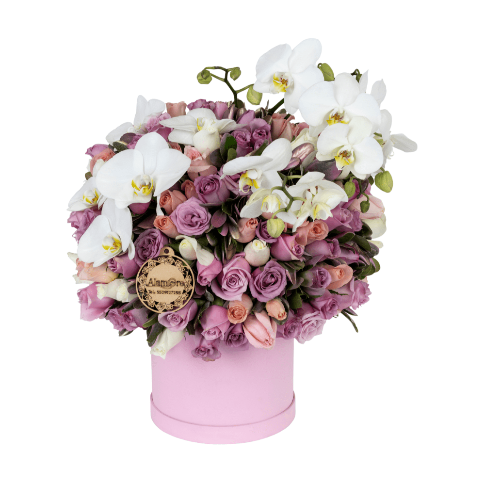 Haz que cada momento sea inolvidable con nuestro arreglo floral de lujo, compuesto por 150 rosas en tonos pastel cuidadosamente seleccionadas y elegantes orquídeas blancas. Esta combinación única, presentada en una sofisticada caja rosa, es perfecta para regalar en cumpleaños, aniversarios, pedidas de mano o simplemente para sorprender a alguien especial con un detalle que deslumbra.